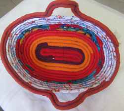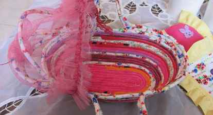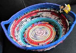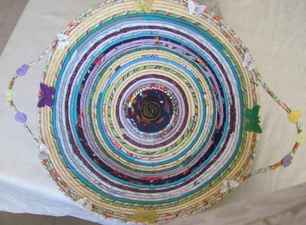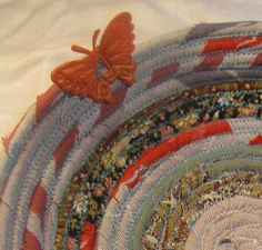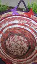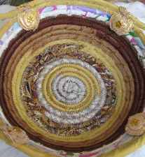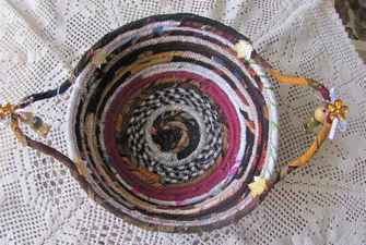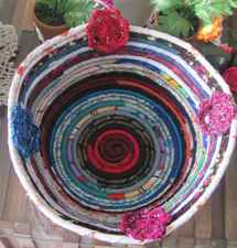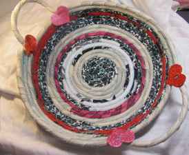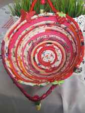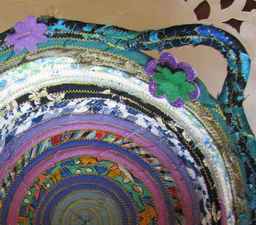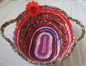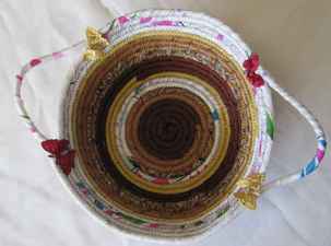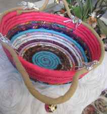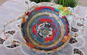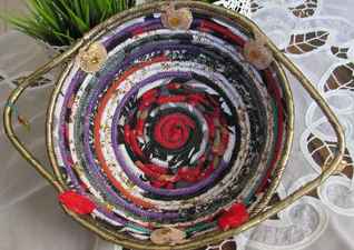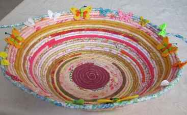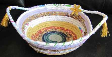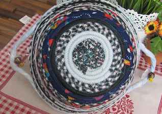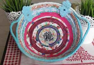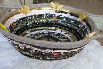 I make my baskets using a special quilted coiled rope technique. I use the fabric as paint, and the sewing machine is my color brush. I usually add small fabric flowers, butterflies, ribbons and other items, as decoration. Each basket is unique and one of a kind, and can be made in any size or color, with or without handles.